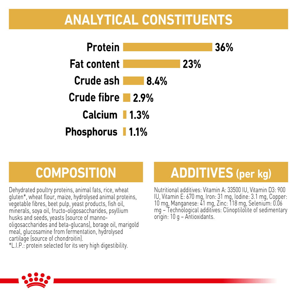 Composition: Dehydrated poultry protein, animal fats, rice, vegetable protein isolate*, maize, wheat flour, hydrolysed animal proteins, vegetable fibres, beet pulp, yeasts and parts thereof, fish oil, soya oil, fructo-oligo-saccharides, psyllium husks and seeds, minerals, hydrolysed yeast (source of manno-oligo-saccharides), yeasts extracts (source of betaglucans), borage oil, marigold extract (source of lutein), hydrolysed crustaceans (source of glucosamine), hydrolysed cartilage (source of chondroitin). Additives: Nutritional additives: Vitamin A: 34000 IU, Vitamin D3: 900 IU, vitamin E: 690 mg; E1 (Iron): 31 mg, E2 (Iodine): 3.1 mg, E4 (Copper): 10 mg, E5 (Manganese): 41 mg, E6 (Zinc): 121 mg, E8 (Selenium): 0.06 mg - Technological additives: Clinoptilolite of sedimentary origin: 10 g - Preservatives - Antioxidants. Analytical constituents: Protein: 36.0% - Fat content: 23.0% - Crude ash: 8.3% - Crude fibres: 2.9% - Calcium: 1.32% - Phosphorus: 1.15%. Please Note: Royal Canin takes pride in ensuring the scientific reliability of all product information. The information in this product listing was true and accurate at the time of publication. However, please note that from time to time, for example due to ingredient availability or a change in sourcing factory within our global factory network for the purpose of ongoing supply, it is necessary to make product changes at short notice, and there may be some delays in updating the information in our product materials.