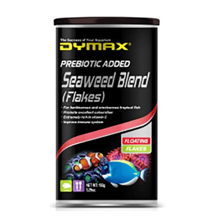 Dymax Seaweed Blend is an all natural and nutritious formula which is rich in vitamin C and enhanced with natural garlic extract to increase acceptance on wild caught or finicky eaters and helps promote fish health as garlic is a natural ingredient for parasite prevention. This product is an optimal food source for marine herbivores such as Wrasses; Damsels; Tangs; Angels and other fresh water herbivorous fish; which is 100% digestible. Promotes excellence colouration. Improves immune system. Feeding Instructions: Feed 2 to 3 times daily the amount of food the fish will consume within 5 minutes. Avoid over feeding and always remove left over food after the feeding period. 150g Can.