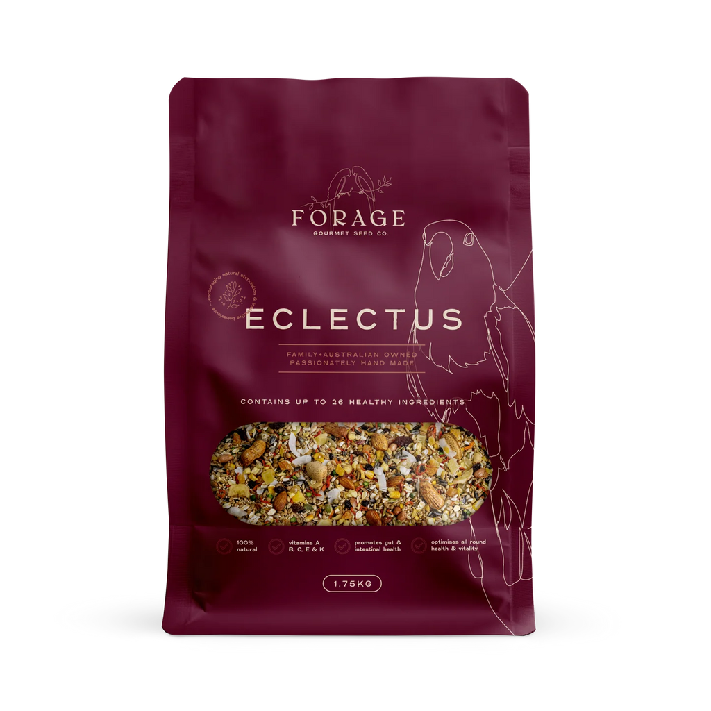 Ingredients in the Forage Eclectus blend can assist in worm prevention, promote gut health and boost immunity. Vitamins A-K and omega-rich Flaxseed improve feathers while Chilli can help warn off worms and promote general well-being.