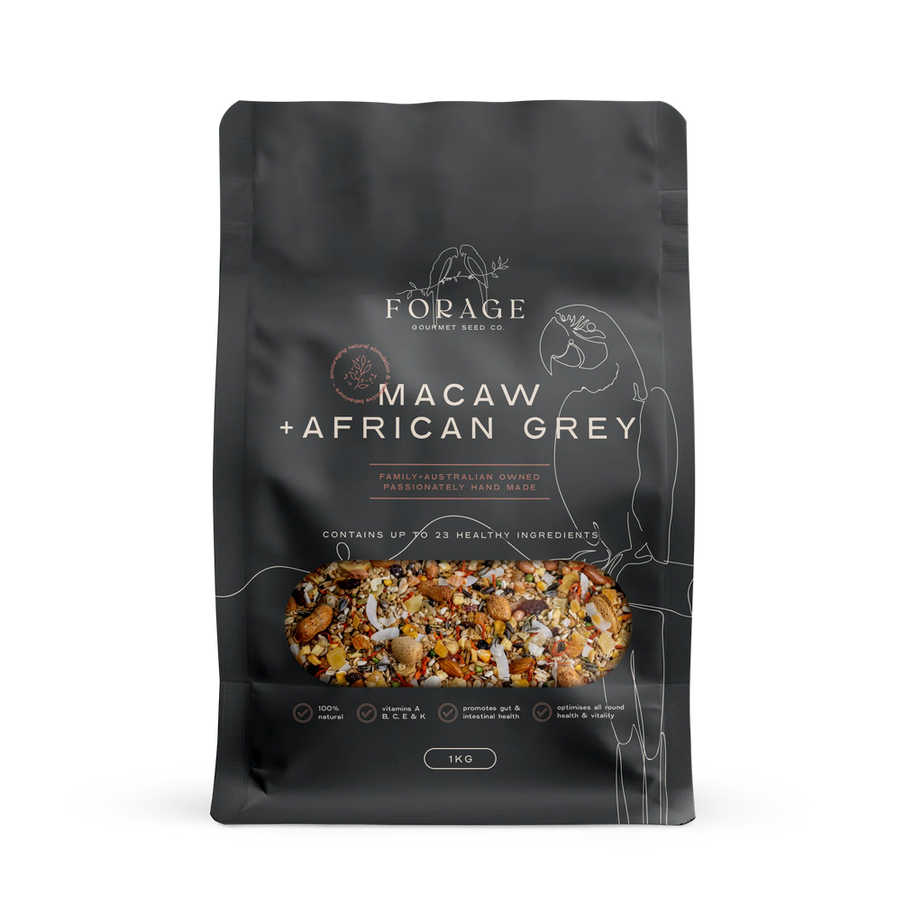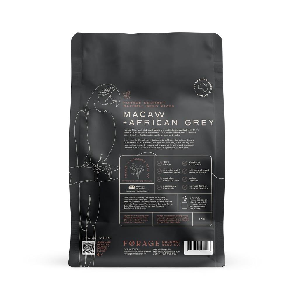 Ingredients in Forage Macaw, African Grey and Amazon blend can assist in worm prevention, promote gut health and boost immunity. Vitamins A-K and omega-rich Flaxseed improve feathers while Chilli can help warn off worms and promote general well-being.