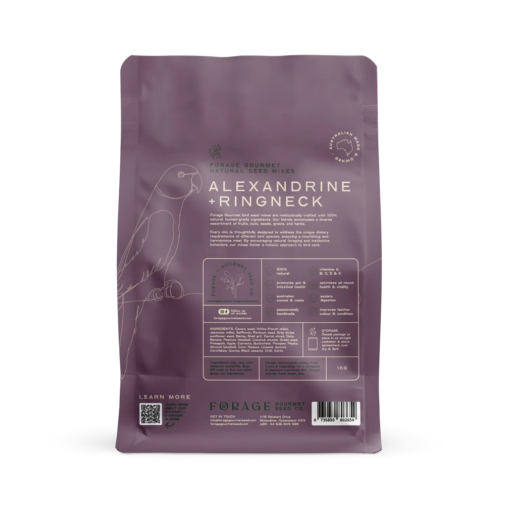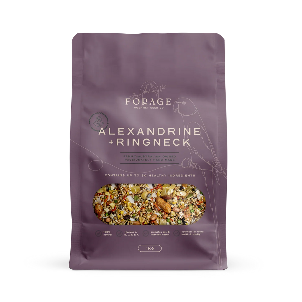Forage Alexandrine/Ringneck is hand-blended with 34 different human-grade seeds, herbs, vegetables, fruits, nuts and grit, offering your bird healthy nutrition they will love while encouraging natural foraging behaviours. Suitable for Alexandrines, Indian-Ringnecks, Moustache, Plumheads and all other Asiatic species.
