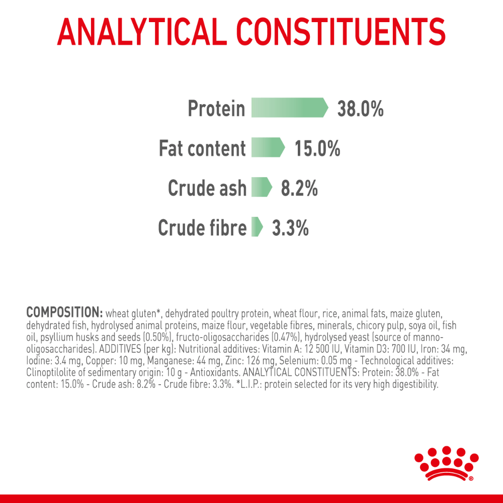 Composition: Vegetable Protein Isolate*, Wheat Flour, Dehydrated Fish, Rice, Animal Fats, Dehydrated Poultry Protein, Hydrolysed Animal Proteins, Maize Gluten, Maize Flour, Vegetable Fibres, Chicory Pulp, Minerals, Soya Oil, Fish Oil, Fructo-Oligo-Saccharides (0.3%), Psyllium Husks And Seeds (0.2%). *LIP: Protein selected for its very high assimilation. Additives (Per Kg). Nutritional Additives: Vitamin A: 18000 IU, Vitamin D3: 900 IU, E1 (Iron): 42 mg, E2 (Iodine): 4.2 mg, E4 (Copper): 13 mg, E5 (Manganese): 54 mg, E6 (Zinc): 114 Mg - Technological Additives: Clinoptilolite of sedimentary origin: 10 G -Preservatives - Antioxidants. Please Note: Royal Canin takes pride in ensuring the scientific reliability of all product information. The information in this product listing was true and accurate at the time of publication. However, please note that from time to time, for example due to ingredient availability or a change in sourcing factory within our global factory network for the purpose of ongoing supply, it is necessary to make product changes at short notice, and there may be some delays in updating the information in our product materials.