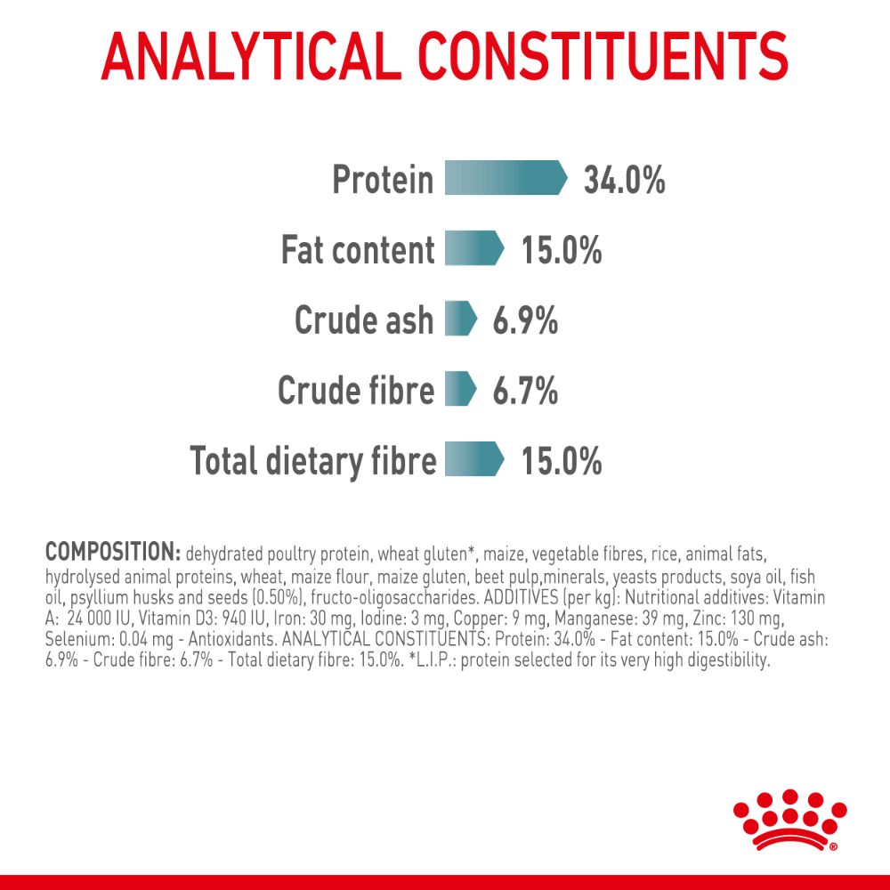 Compostion: dehydrated poultry protein, vegetable protein isolate*, maize, vegetable fibres, rice, animal fats, hydrolysed animal proteins, wheat, maize flour, maize gluten, beet pulp, yeasts, minerals, soya oil, fish oil, fructo-oligo-saccharides, psyllium husks and seeds (0.5%). Additives (per kg): Nutritional additives: Vitamin A: 24000 IU, Vitamin D3: 900 IU, E1 (Iron): 30 mg, E2 (Iodine): 3 mg, E4 (Copper): 9 mg, E5 (Manganese): 39 mg, E6 (Zinc): 117 mg, E8 (Selenium): 0.05 mg - Preservatives - Antioxidants. Analytical Constituents: Protein: 34% - Fat content: 15% - Crude ash: 6.9% - Crude fibres: 6.9% - Total dietary fibres: 15.1%. *L.I.P.: Protein selected for its very high assimilation. Please Note: Royal Canin takes pride in ensuring the scientific reliability of all product information. The information in this product listing was true and accurate at the time of publication. However, please note that from time to time, for example due to ingredient availability or a change in sourcing factory within our global factory network for the purpose of ongoing supply, it is necessary to make product changes at short notice, and there may be some delays in updating the information in our product materials.