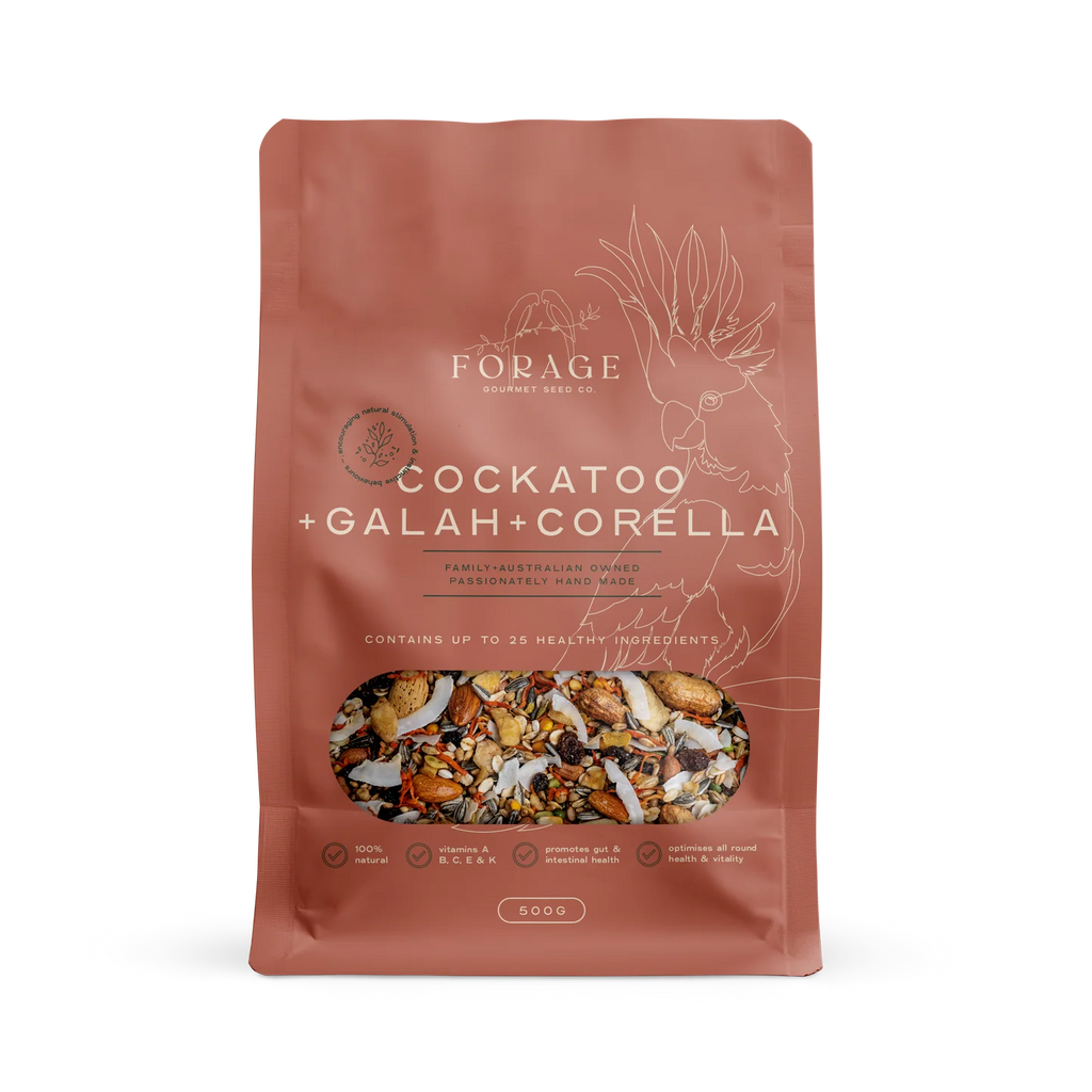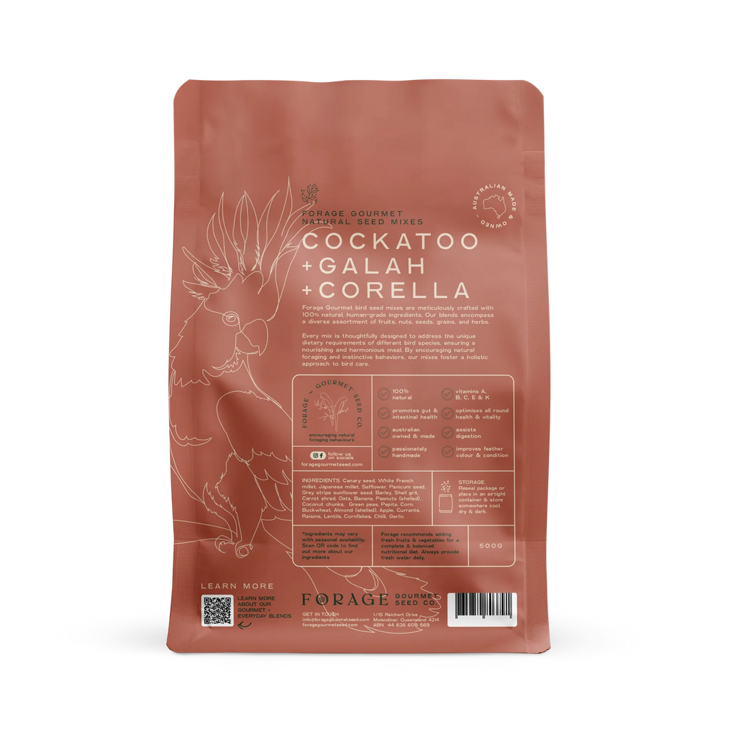 Ingredients in Forage Galah, Corella and Cockatoo blend can assist in worm prevention, promote gut health and boost immunity. Vitamins A-K and omega-rich Flaxseed improve feathers while Chilli can help warn off worms and promote general well-being.
